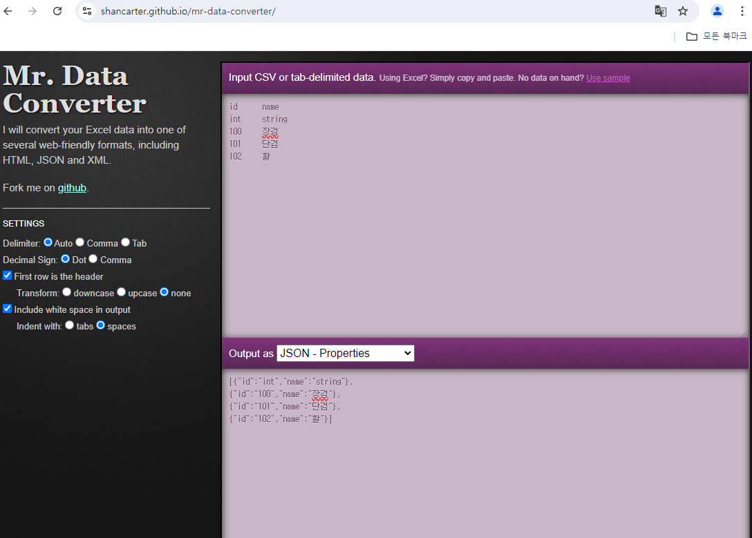 2. 엑셀 파일에 입력한 데이터를 복사해 json 변환기에서 변환, 복사