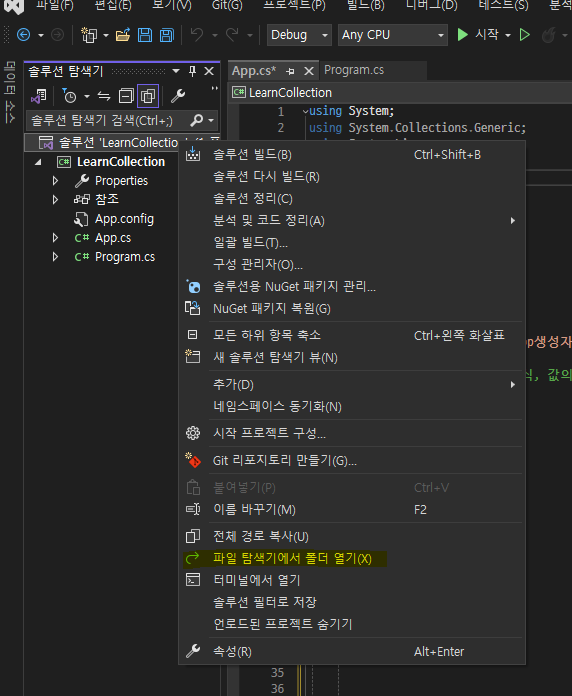 - 솔루션에서 우클릭 > 파일탐색기에서 폴더 열기