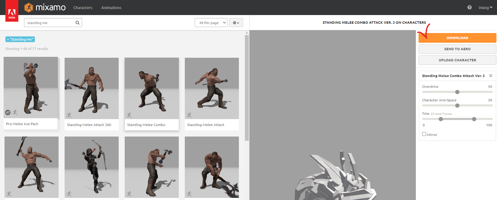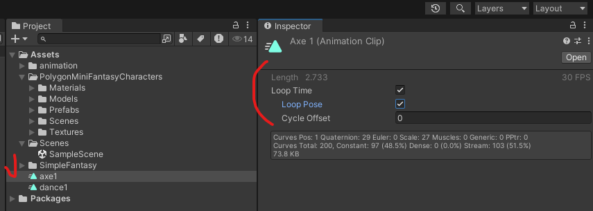 3. 프로젝트 창에 생성된 이름: mixamo.com 애니 클립이 그 다운 받은 애니가 맞는지 확인하기