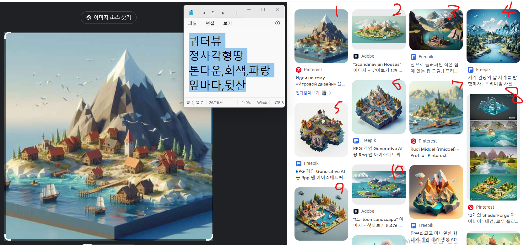 | 번호 | 쿼터뷰 | 정사각형땅 | 톤다운,회색,파랑 | 앞바다,뒷산 | 점수 |
