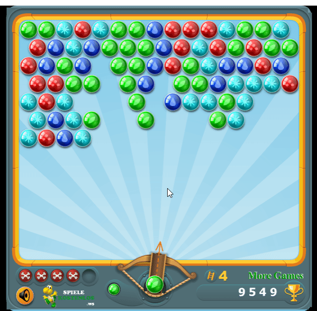 하단에서 구슬을 쏘아 상단에 정렬된 구슬에 맞춰 색이 같은 구슬이 3개 이상 닿으면 같은 색 구슬이 깨져 사라짐.