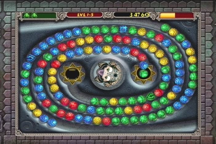 ![]() | Zuma 2004년 올해의 게임 두꺼비 입에서 구슬을 쏘아 밀려오는 구슬이 구멍이 들어가지 않게 3개 이상 같은 색의 구슬을 붙여 깨뜨림 압박감이 상당하나 중간 구슬을 깨면 비는 부분이 생김 붙어 있는 같은 색 구슬만 깨지기 때문에 한 번에 없애는 맛은 없음 4종(파,노,초,빨) |