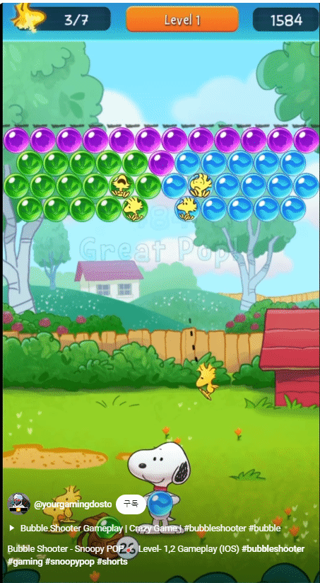 ![]() | Bubble Shooter - Snoopy POP! 터진 구슬의 잔상이 남고 점수를 표시 터뜨린 개수에 따른 문구와 이펙트 리액션 갇힌 새를 구함 제일 깔끔 이펙트와 글자가 해상도 최적화를 안해서 기기 별로 실제 플레이 화면이 다름 이펙트가 글자와 겹치지 않는게 더 깔끔 10*12 5종(빨,초,보,노,분) 유리 등 스킬 구슬 다수 존재 |