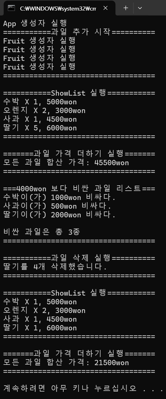 Console.WriteLine("=======과일 가격 더하기 실행=======");