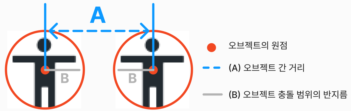 - 오브젝트 간 충돌 감지 방법 : A <= B+B : 충돌했다!